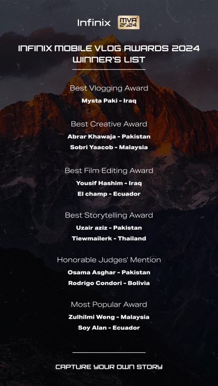 "The MVA has quickly become a game-changer in the world of mobile vlogging, setting the stage for young creators to make their mark in the digital space. By making high-quality content creation accessible to everyone, Infinix is breaking down barriers and empowering young people to follow their passions, no matter where they come from," said Lake Hu. Here's to the next generation of global storytellers!