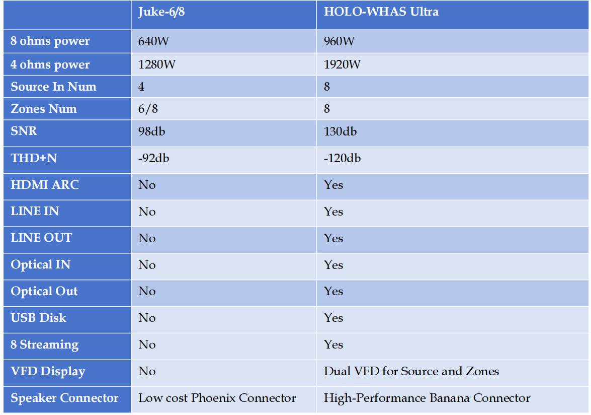 When comparing the HoloWhas Ultra to the JUKE-6/8, the differences are stark. The HoloWhas Ultra offers higher power output (60W per channel vs. 40W), supports more streaming inputs (eight vs. four), and features high-performance Banana Plugs instead of the Phoenix connectors found in the JUKE-6/8. The VFD display on the HoloWhas Ultra provides detailed control and monitoring, a feature missing in the JUKE-6/8.