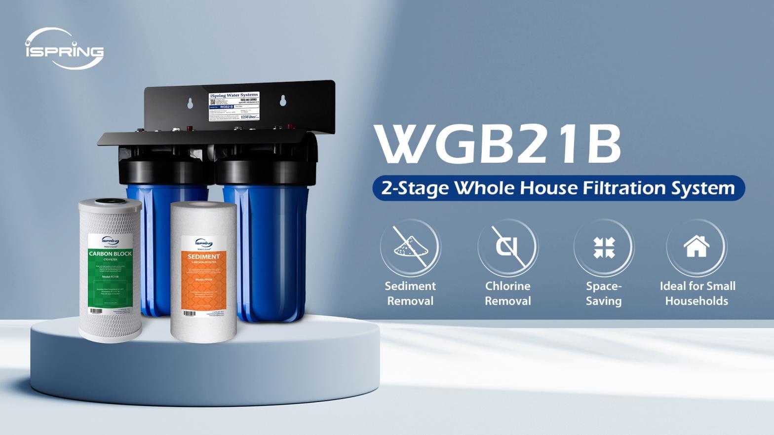 WGB21B: A compact 2-stage whole house water filtration system designed for small homes or apartments. Effectively reduces sediment, chlorine, rust, and odors to deliver cleaner water at every tap. Features a durable stainless steel frame and easy installation.