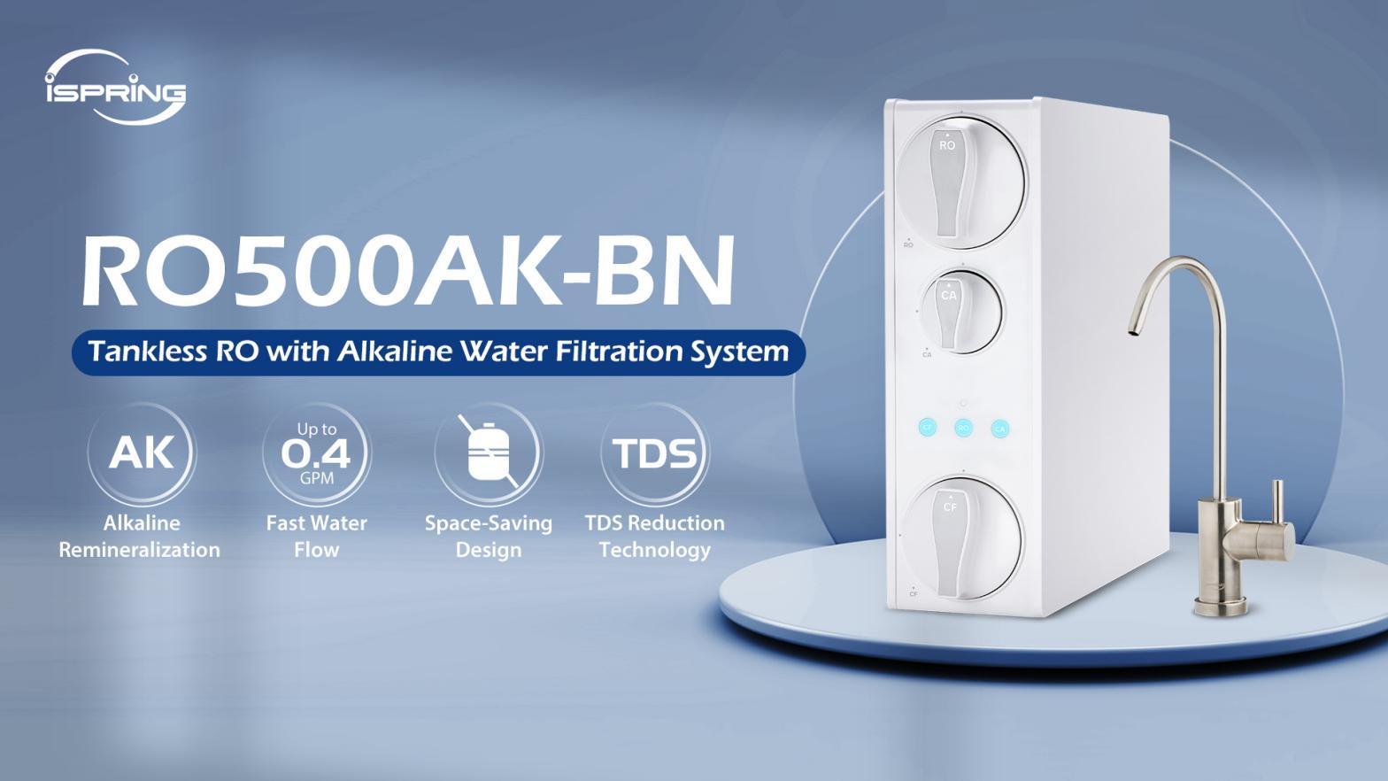 RO500AK-BN: A tankless under sink reverse osmosis system with 500 GPD fast flow and natural pH alkaline remineralization. NSF certified and designed to reduce PFAS, lead, arsenic, and more. Offers a high 2:1 pure-to-drain ratio and built-in filter life reminders. Sleek, space-saving design ideal for modern kitchens.
