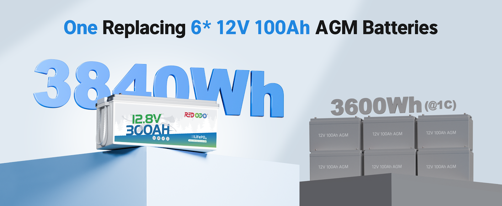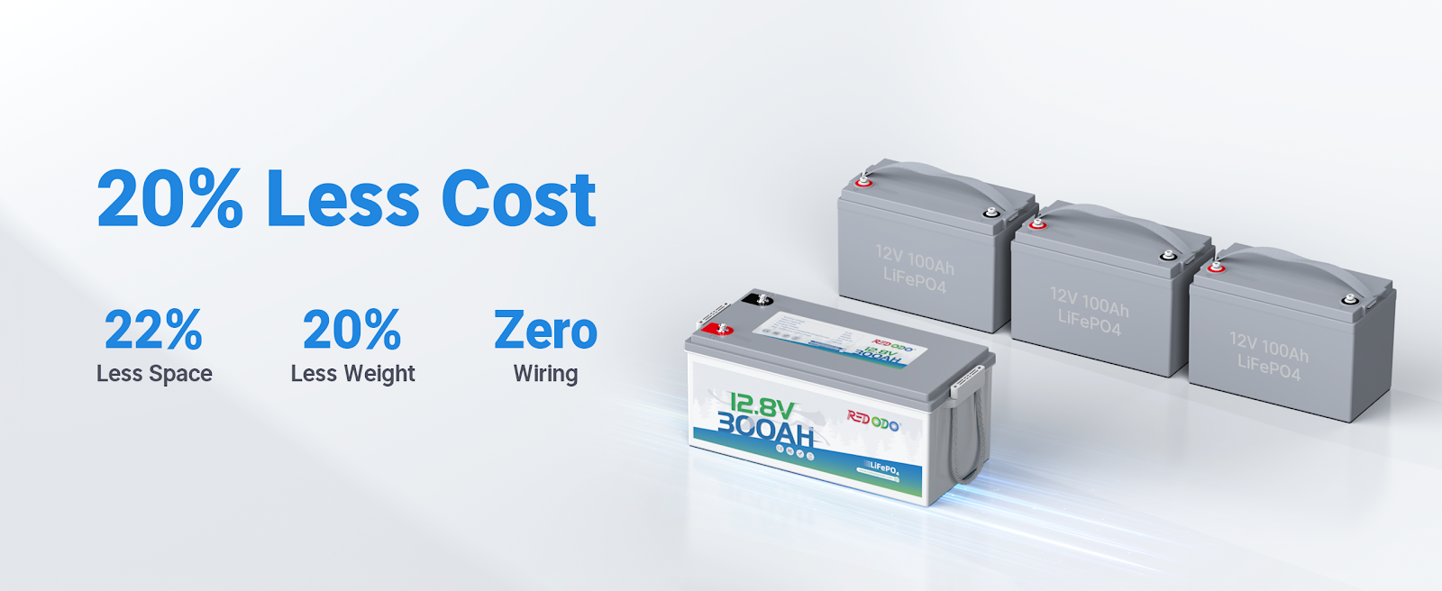 Ditch messy parallel connections! The Redodo 12V 300Ah lithium battery delivers 3x100Ah capacity in one sleek unit — 20% lighter than traditional setups, 22% more space-efficient, and 20% more budget-friendly. Install in minutes, power for days.