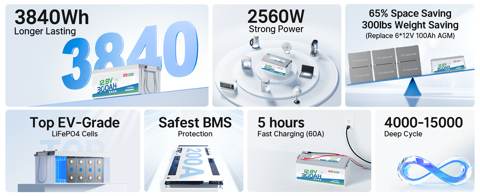 The Redodo 12V 300Ah LiFePO4 battery greatly meets the high power demand of RVs in summer. It is compact and powerful, with a large energy of 3.84kWh and a high power output of 2560W, perfect for powering devices during long RV trips, power outages or off-grid adventures.