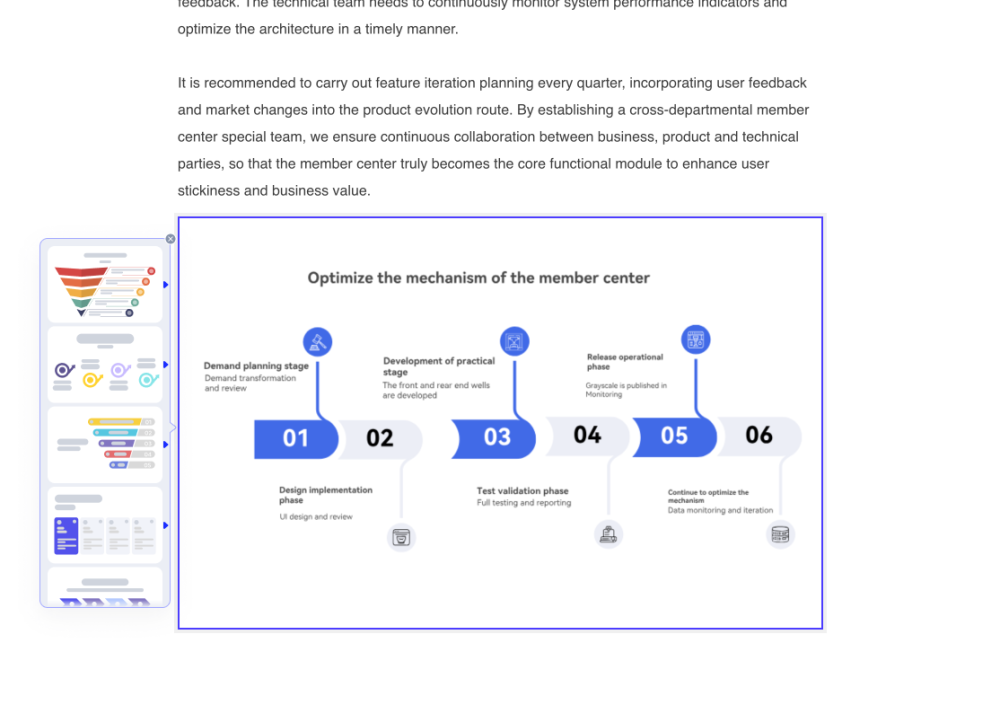 PicDoc deeply integrates AI capabilities, fully supporting text input, file import (PDF/Word/images, etc.) and AI writing assistant three major creation methods. After inputting the theme keywords (such as "e-commerce promotional program"), the system intelligently generates a complete outline and the first draft of the text, which significantly improves the efficiency of content creation; for the uploaded industry reports and other documents, it can quickly distill the core conclusions and data relationships to effectively avoid the risk of information overload; based on semantic parsing, it generates flowcharts/funnel diagrams and other professional views in seconds, which can be seamlessly adapted to the meeting. Based on semantic parsing, professional views such as flowcharts/funnel diagrams are generated in seconds, seamlessly adapting to meeting decision-making, report presentation and other scenarios, and realizing the full-process intelligence of "Content Creation→Information Purification→Visual Expression".