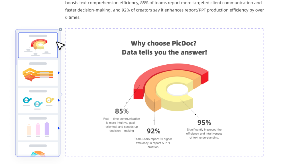 When the operation team inputs multi-dimensional business efficiency indicators (e.g. "95% of professional visualization users think ...... 85% of team feedback on ...... and 92% of creators say ......") PicDoc intelligently extracts core data relationships and automatically generates multi-layer comparison charts with data annotations for quarterly corporate reports.