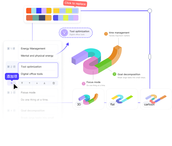 All text and graphics can be modified individually by dragging and dropping, and there is a built-in business / technology / creative multi-style material library, which allows you to change the colors and fonts by clicking on them. No need to design background to produce both professional and aesthetic visualization works.