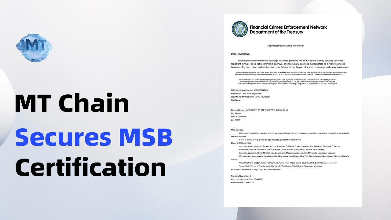 By obtaining MSB certification, MT Chain can offer global users secure, transparent financial services, and build partnerships with compliant exchanges and financial institutions.