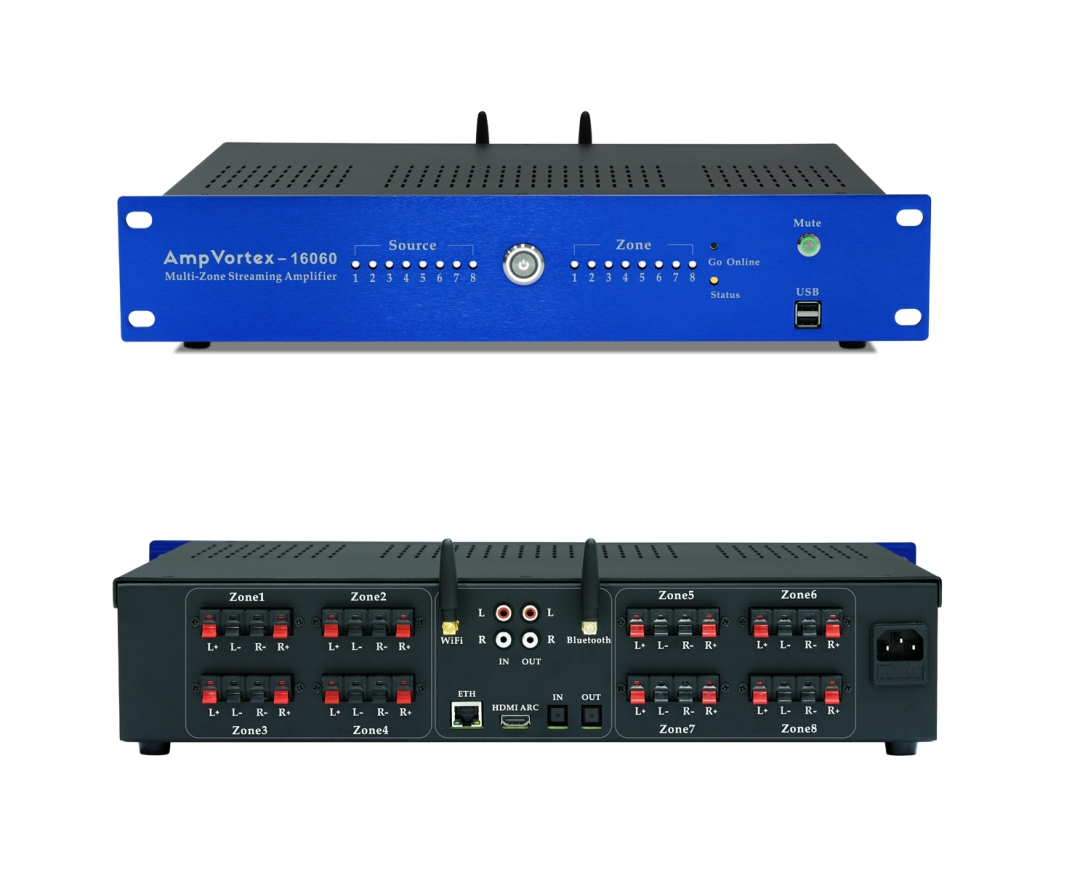 AmpVortex-16060 | Flagship multi-room amplifier with WiFi streaming (AirPlay 2, Spotify Connect, DLNA, etc.) | 8 zones / 16 channels, ~65W per channel (~1040W total) | Large homes seeking robust whole-home audio coverage. |