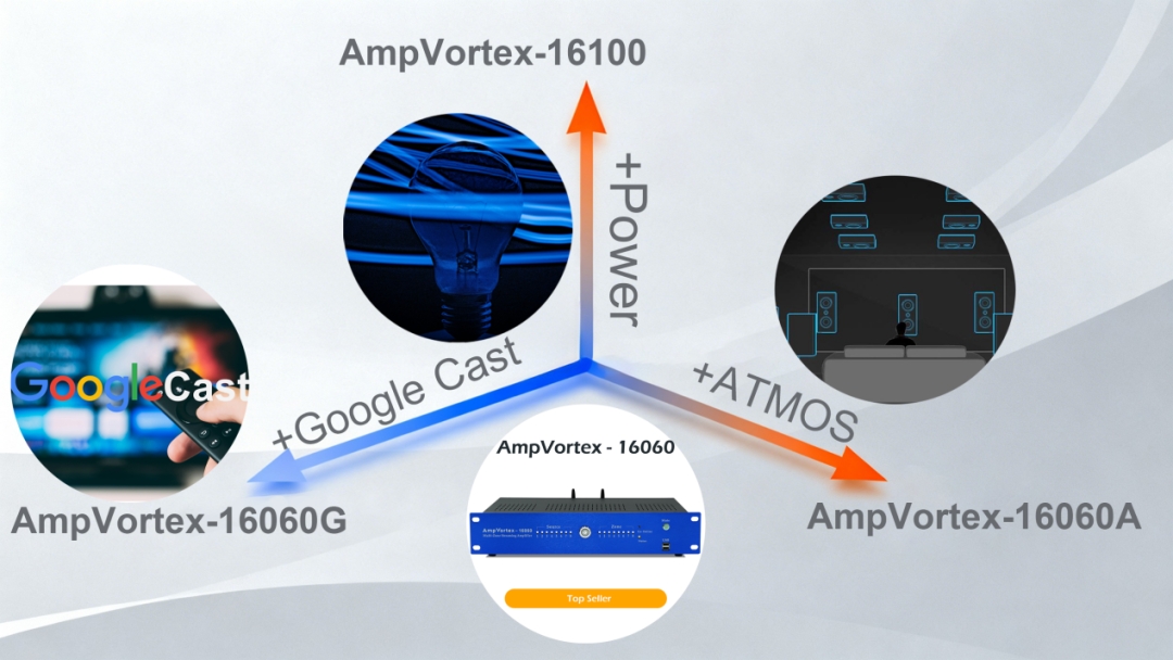 AmpVortex-16060G | “G” stands for Google Cast, in addition to AirPlay 2, Bluetooth, HDMI ARC, SPDIF, USB, and more | 8 zones / 16 channels, ~65W per cha | Smart homes that require the widest range of streaming and casting compatibility. |