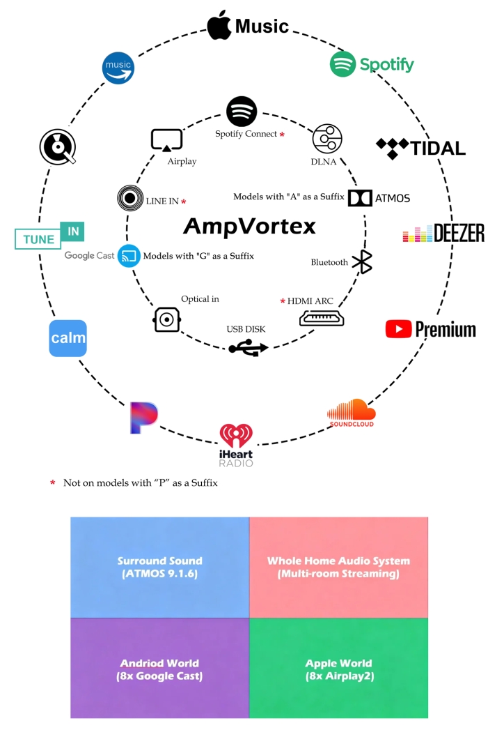 Compatible with major music protocols and platforms, and supports both Android and iOS. Wireless transmission methods include DLNA, Spotify, Airplay 1 & 2, and Bluetooth 5.0, Google Cast (AmpVortex-16060G). Wired transmission methods include HDMI ARC, Optical, Line In, and USB Disk, HDMI EARC and HDMI with ARMOS (AmpVortex-16060A).