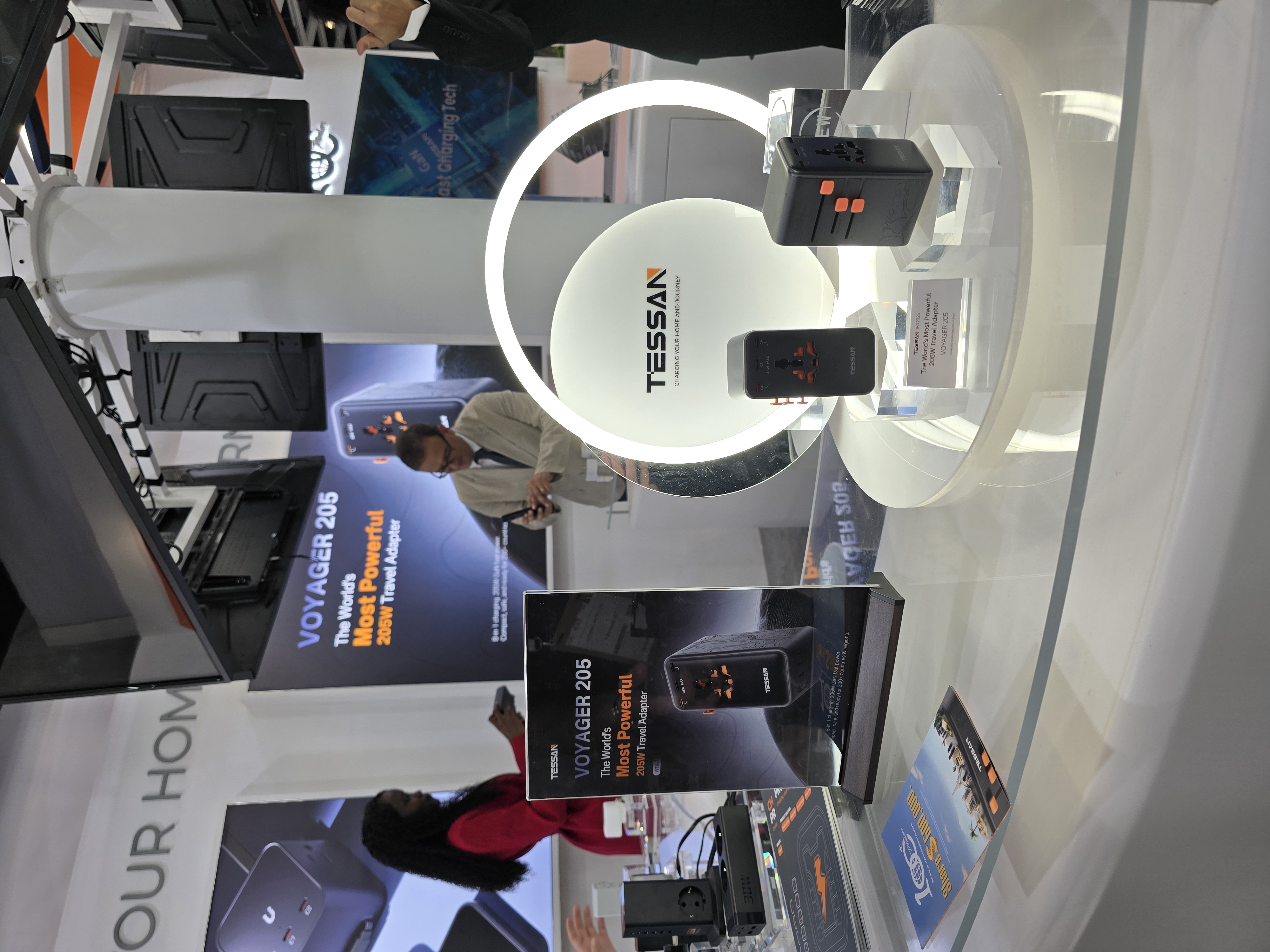 Leading the product showcase is the TESSAN Voyager 205, the world's first universal travel adapter with a staggering 205W total output—140W available on a single USB-C port. This 8-in-1 device consolidates what would typically require multiple bulky chargers into one sleek, globally compatible hub.
