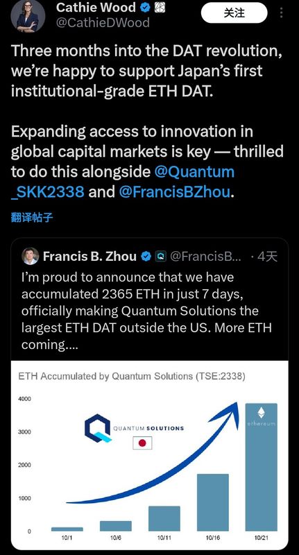 “We have accumulated 2,365 ETH in just seven days, officially making Quantum Solutions the largest ETH DAT outside the United States. More ETH coming.”