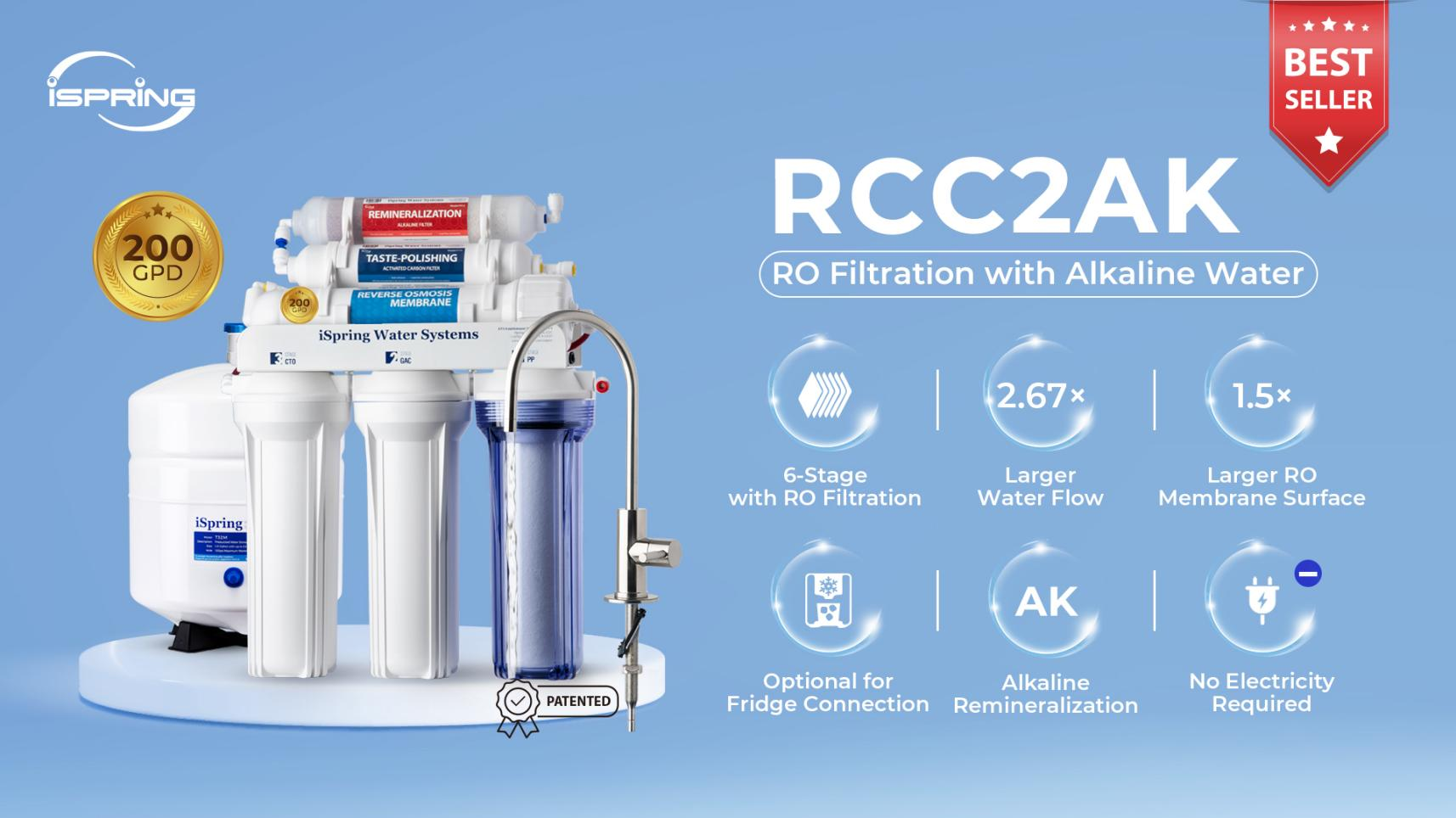 RCC2AK:Building on iSpring's best-selling under-sink reverse osmosis system with an alkaline remineralization filter, the RCC2AK upgrades to a 200 GPD high-flow design, ideal for families and offices. Its patented top-mounted faucet design makes faucet installation quick and tool-free, while the clear first-stage housing allows easy filter monitoring. The remineralization stage restores calcium and magnesium for balanced pH and a clean, refreshing taste.