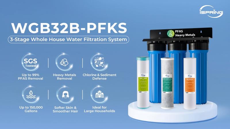 Built on iSpring’s decades of water filtration expertise, the newly launched WGB32B-PFKS offers comprehensive whole-house protection with upgraded SGS-tested media that reduces up to 99 % of PFAS, including PFOA and PFOS. Combining high-capacity PP and carbon filters, it effectively removes sediment, chlorine, and other common contaminants while maintaining strong flow and durability. Introduced this fall, it has quickly gained popularity among homeowners, offering a reliable, future-ready solution for safer water at every tap.