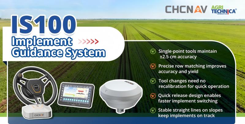 IS100 (Implement Guidance): Uses the actual implement position as reference to eliminate drift, significantly improving row spacing and straightness — ideal for slopes, hillsides, and trailed implements.