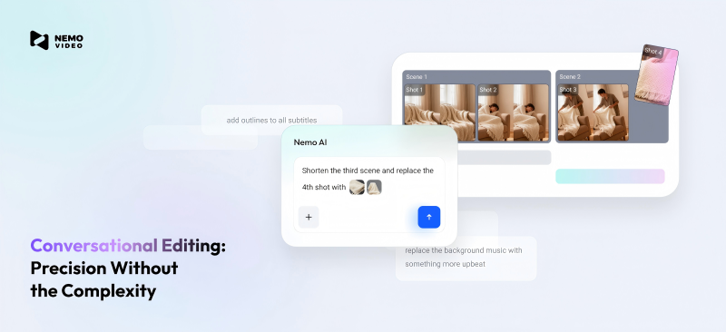 Traditional video editing often demands a steep learning curve and a full marketing team— timelines, keyframes, multi-layer tracks — turning what should be a creative process into a technical burden. Nemo’s Conversational Editing changes that equation entirely.