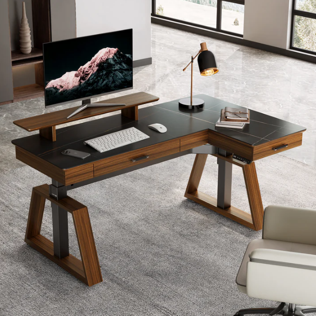 Reclaim your office with the ARK EX L-Shape. This isn't just a desk; it's a comprehensive workspace system. The expansive L-shape gives you unparalleled surface area for multi-monitor setups and project spreads. Its striking aesthetic combines luxurious leather-topped material with rich wood veneer, paired with a multi-tier integrated storage shelf and drawers. This is the ultimate station for high-level productivity, offering both the grandeur and the functional organization an executive demands.